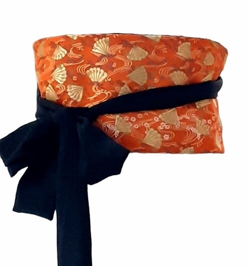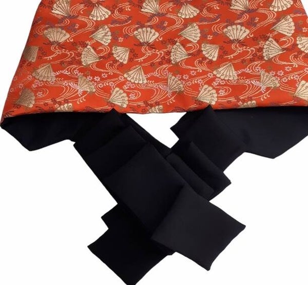 Deze design obi-belt heeft een middenstuk van 68cm van pure en antieke kinran zijde en een hoogte van 15,5cm. Het patroon is waaiertjes in zuiver goud op vermillion gekleurde zijde. De achterkant is zwarte zijde en de zwartzijden strikbanden zijn 96x7cm per band.