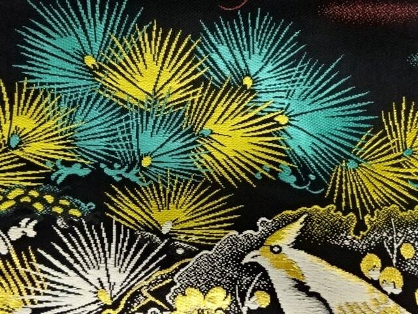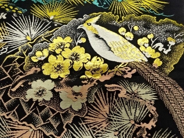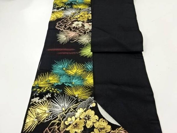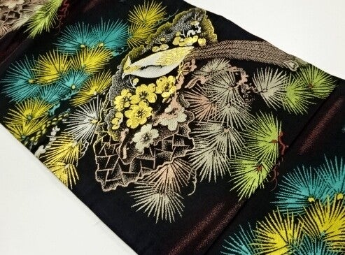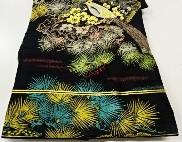Deze antieke zwart zijden geweven Nagoya obi is in nieuwstaat. De kleuren zijn prachtig en helder en de obi heeft een vrijwel doorlopend patroon.