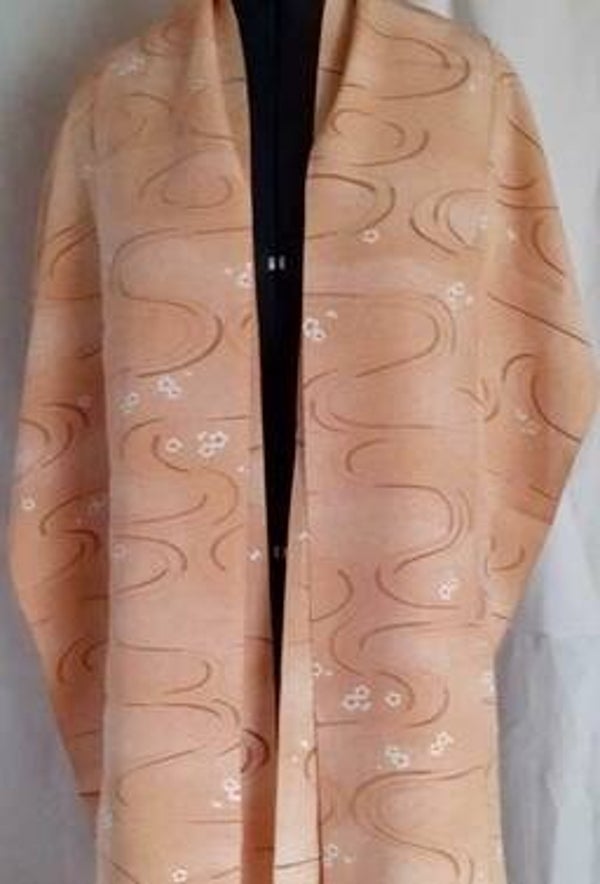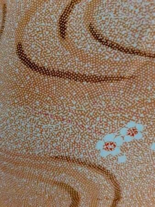 Vintage (1960) soepele Sakura zijde met subtiele wave en bloemen motieven. Geschikt voor patchwork, quilt, maison en ook heel mooi voor kleding, etc. De kleur is goudbeige met een steenoranjeachtige gloed. De zijde zelf is bewerkt met kleine creme stipjes.