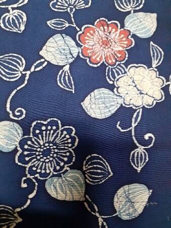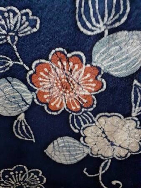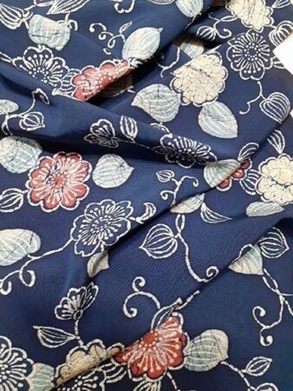 Leuke vintage (1950-60) zijde met craquelé bloemen en bladeren. Marineblauw. Geschikt voor quilt en patchwork, tassen en (afwerken van) kleding