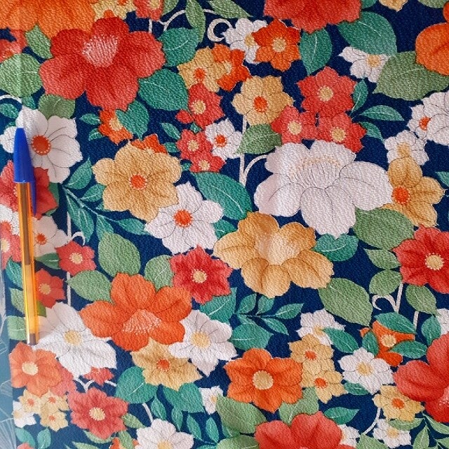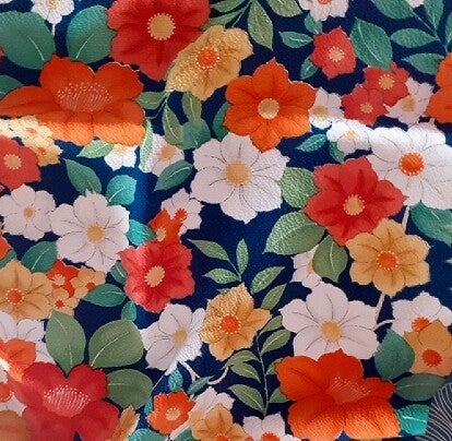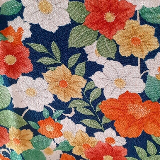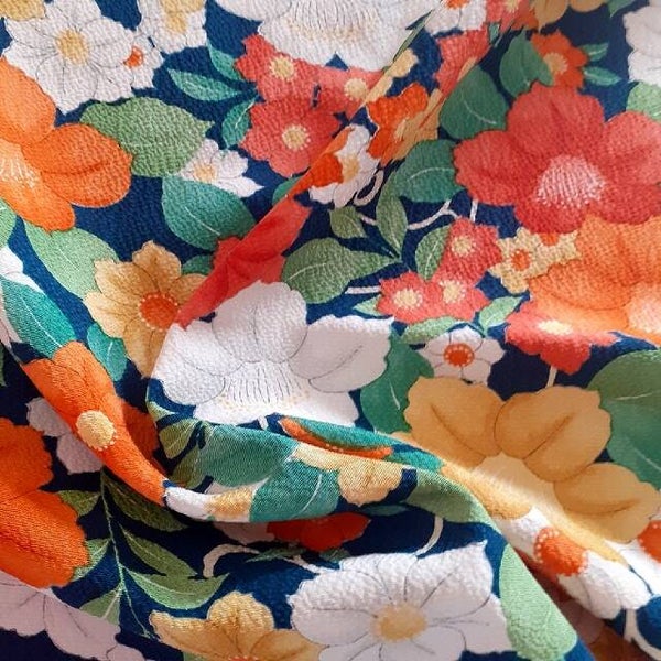 Japanse antieke kimono crepezijde diep marineblauw met heldere bloemen. Handbedrukt met natuurlijke kleuren.Geschikt voor quilt, patchwork, (afwerken) kleding, maison