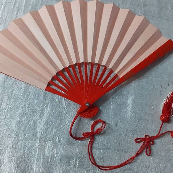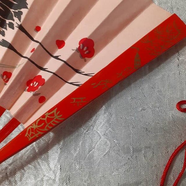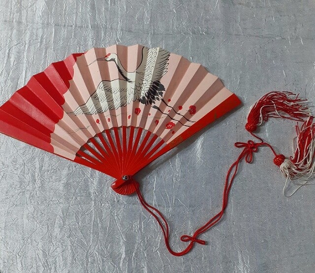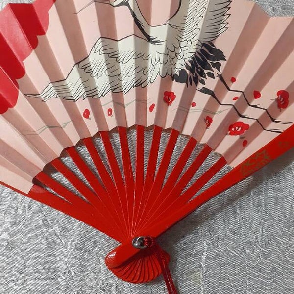 Leuke kleine antieke/vintage waaier met grote kraanvogel en roodgelakte houder.