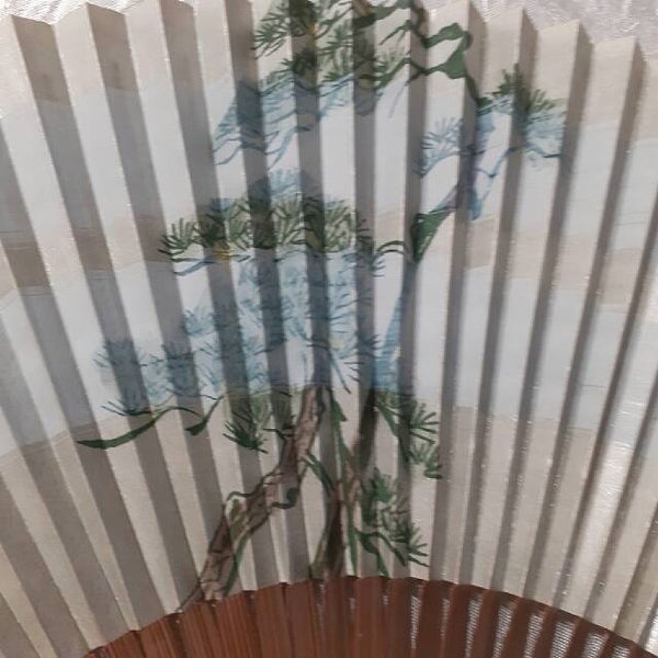 Deze antieke/vintage waaier is gemaakt van prachtig goudgroen zijdepapier en heeft een mooie beschildering van 2 pinetrees.