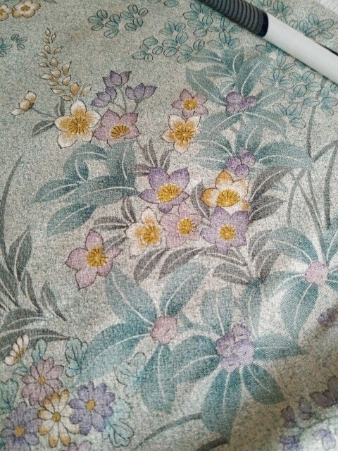 Soepele hemelsblauwe vintage zijde met heldere bloemen.