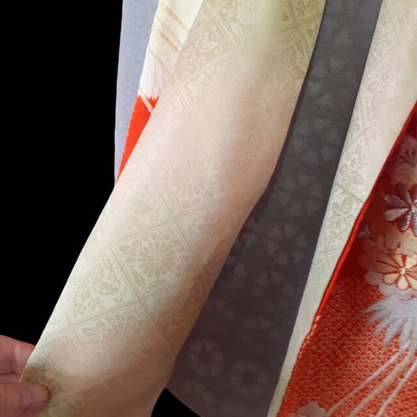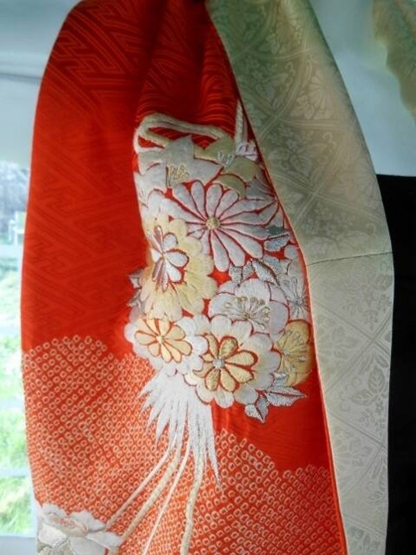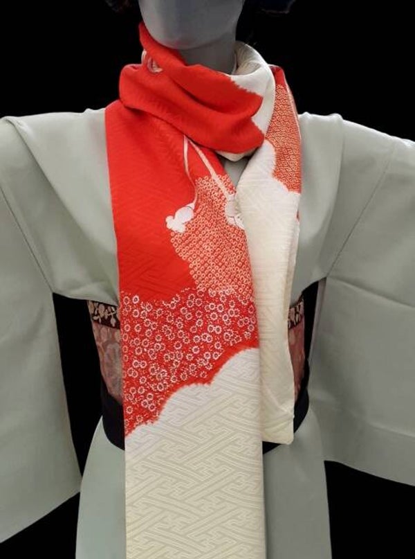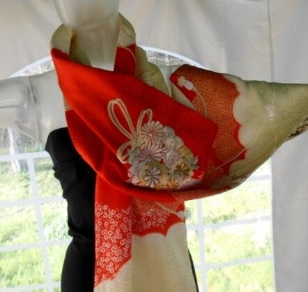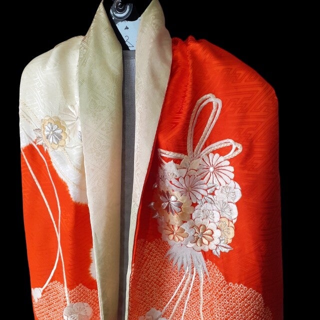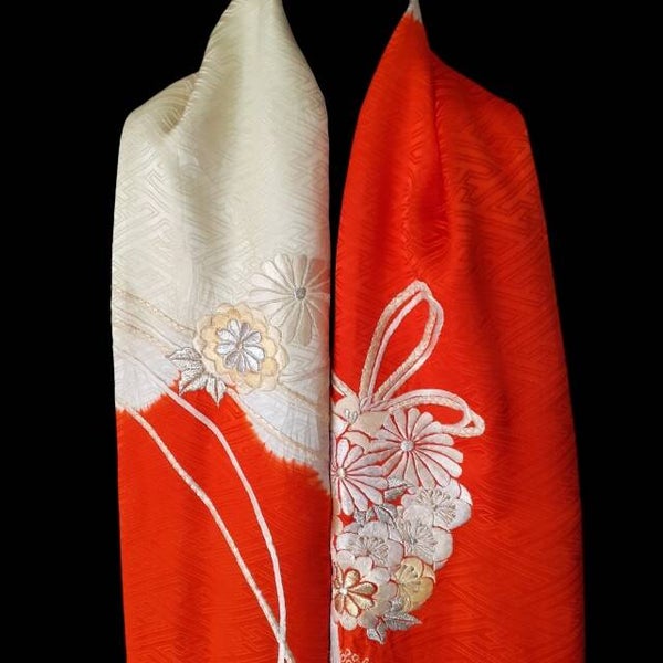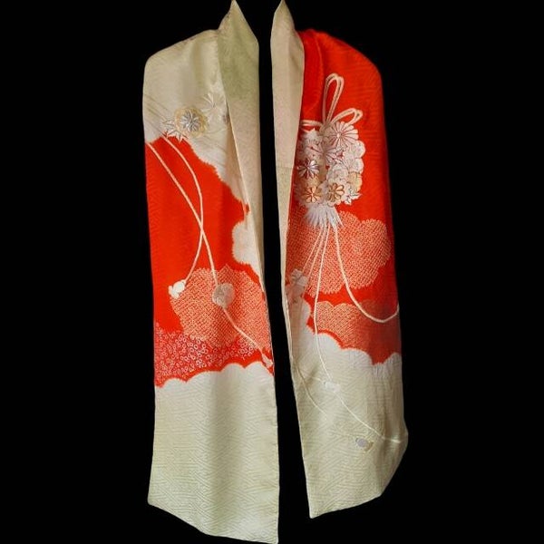 Antieke unieke sjaal met de hand geschilderd en met prachtig groot motief met borduursel. Het is met zijdegarens geborduurd en enkele stukjes met goud- en zilvergaren. De kleur is de bekende Japanse kleur vermiljoen en roomcreme.