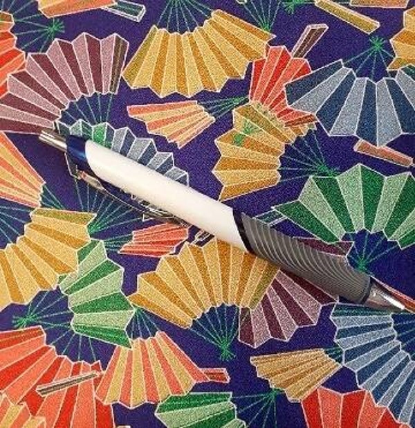 Mooie antieke / vintage glanzende zijde met waaiers. De basiskleur is blauw / paars. Geschikt voor quilten en patchwork, maar ook voor bijvoorbeeld een sjaal of een kledingstuk.
