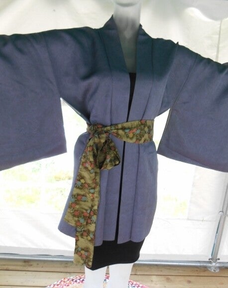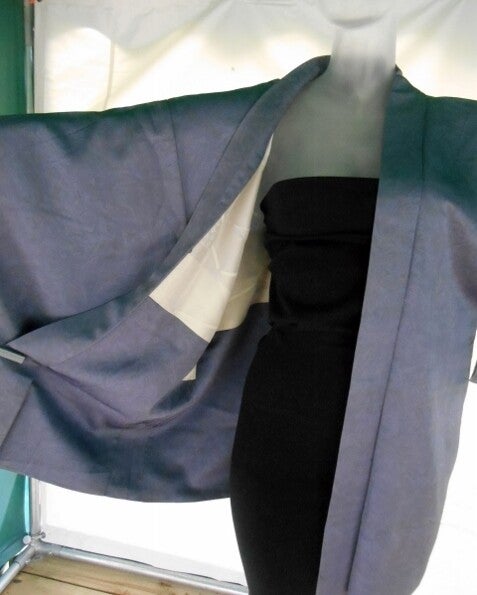Bijzonder mooi is deze haori (rond 1960) met subtiel ingeweven motief. Het jasje is met de hand genaaid en is gevoerd. De kleur is paars met blauwe gloed.Lengte 76cmMouw 43cmSchouders 62cm