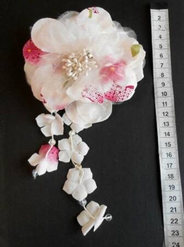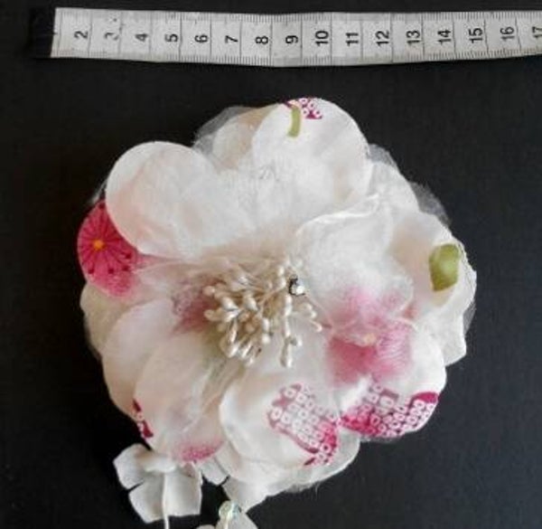 Deze Japanse 23cm lange haarbloem is gemaakt van losse blaadjes van textiel gevormd tot een echte bloem met subtiel wit hartje en verder bijzonder door de loshangende bloesem. Uniek stukje handwerk.