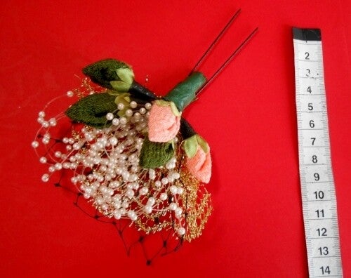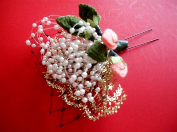 Deze unieke Japanse haarspeld vormt een prachtig boeket met haar zijden bloemknoppen en bladeren. Kleine witte kraaltjes en een subtiel gaasje maken het boeket tot een juweel.