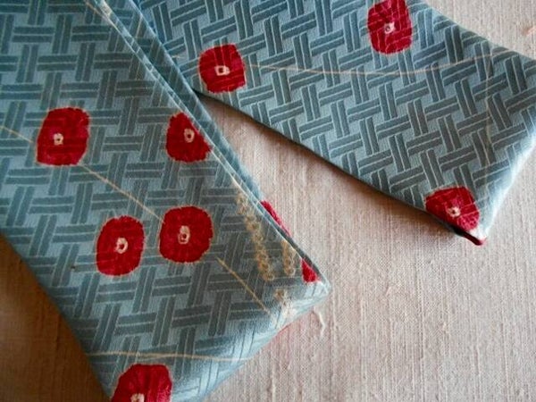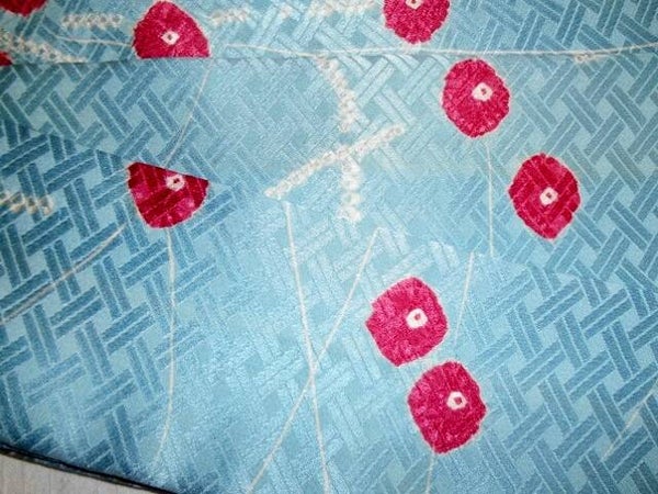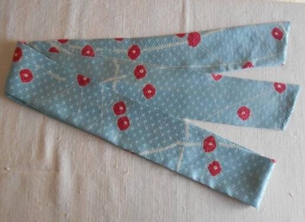 Uniek is deze accessoire met haar heldere lichtblauwe kleur roserode shiboridots. De zijde is van rond 1930-40 en heeft licht (bijna onzichtbaar) een spoortje van de tijd.