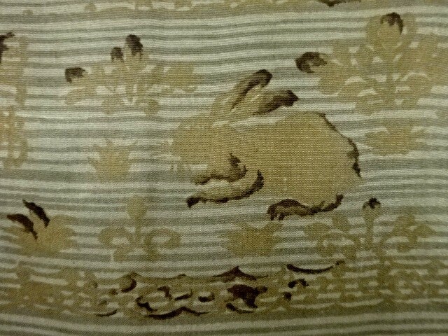 Antieke Japanse korte kimono handgeverfd indigo en modder geverfd. De zijde is wilde (tsumugi) zijde en heeft een voering met afbeeldingen van o.a. een konijn, struiken en een kreeft. De buitenkant van het jasje zelf is blauw.