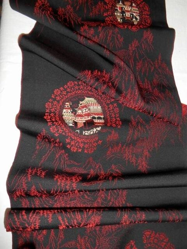 Zwarte kimonozijde met geweven Japanse tempel 160x35cm