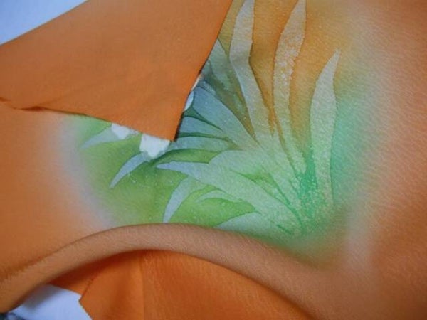 Deze antieke coupons zijn met de handgeverfd op schitterende helder sinaasappeloranje zijde met een mooi motiefje. Een coupon is effen. De coupon is aan beiden zijden gekleurd.