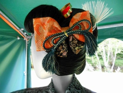 Grote vintage haarstrik, gemaakt van kinran goudbrokaat zijde op en goudkleurige kam.