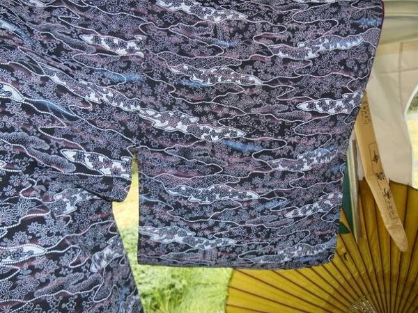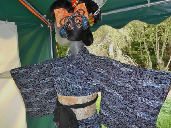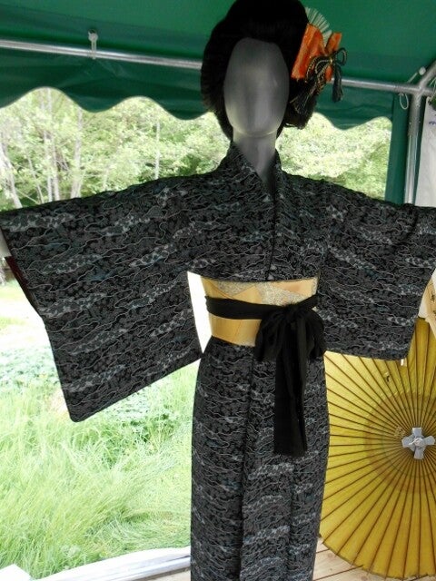 Deze nieuwe en ongebruikte antieke/vintage zwarte kimono met gestipte contouren. Over de natuurzijde zijn lichte veegjes indigo aangebracht, dat zorgt ervoor dat het geheel een uniek patroon heeft.