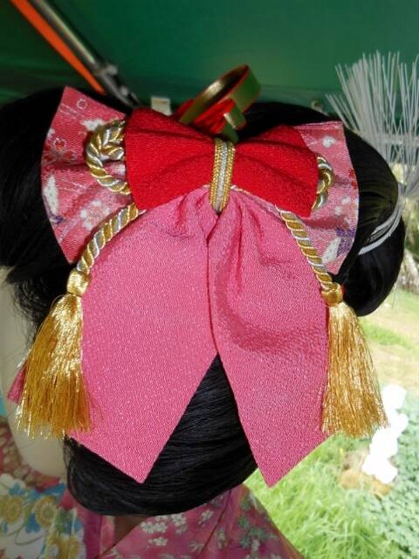 Grote vintage haarstrik, gemaakt van chirimen zijde. De strik is gemaakt op een goudkleurige kam.