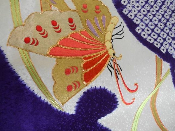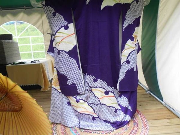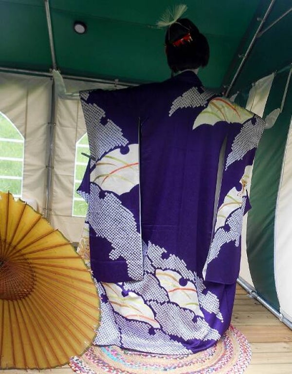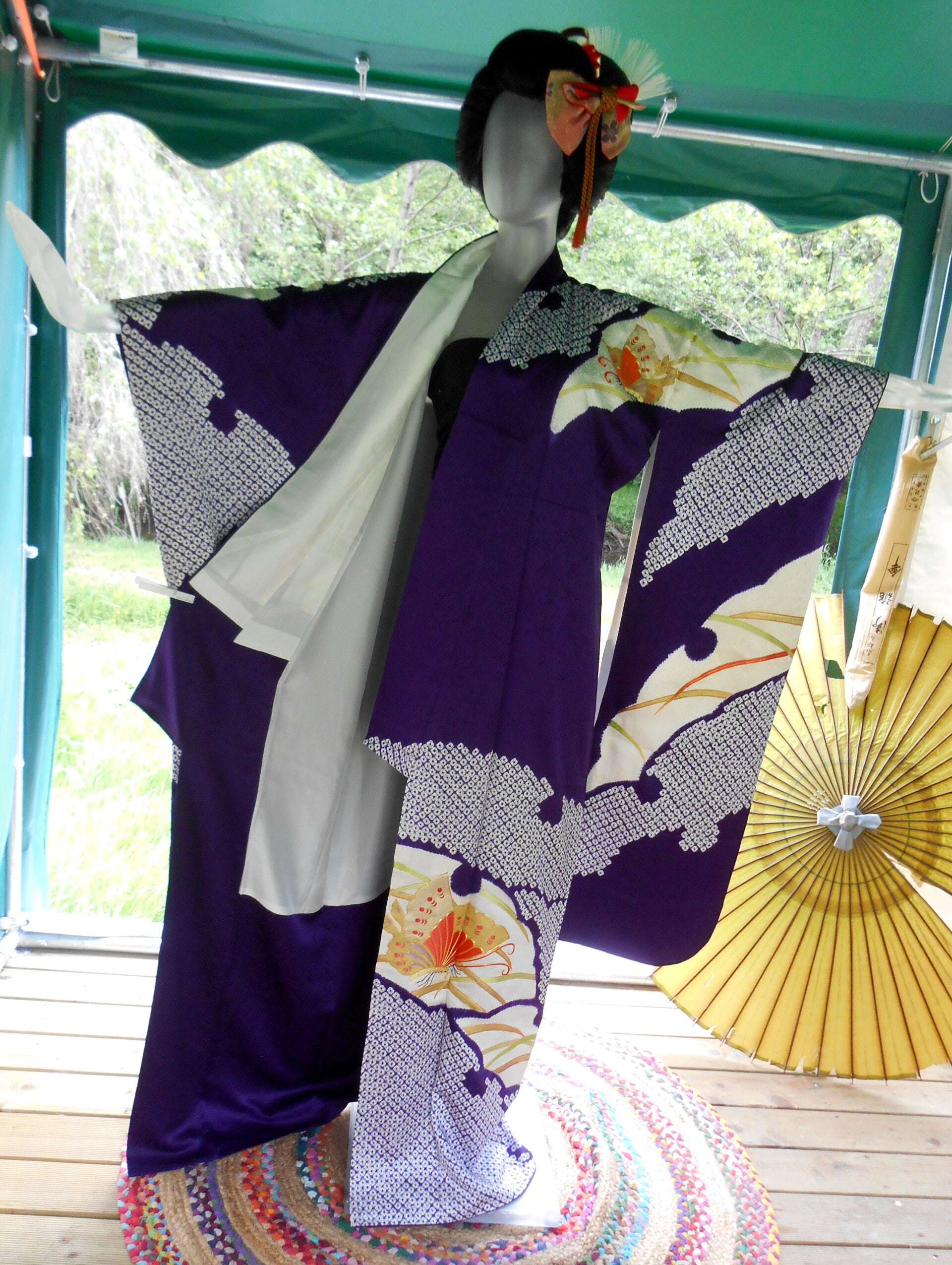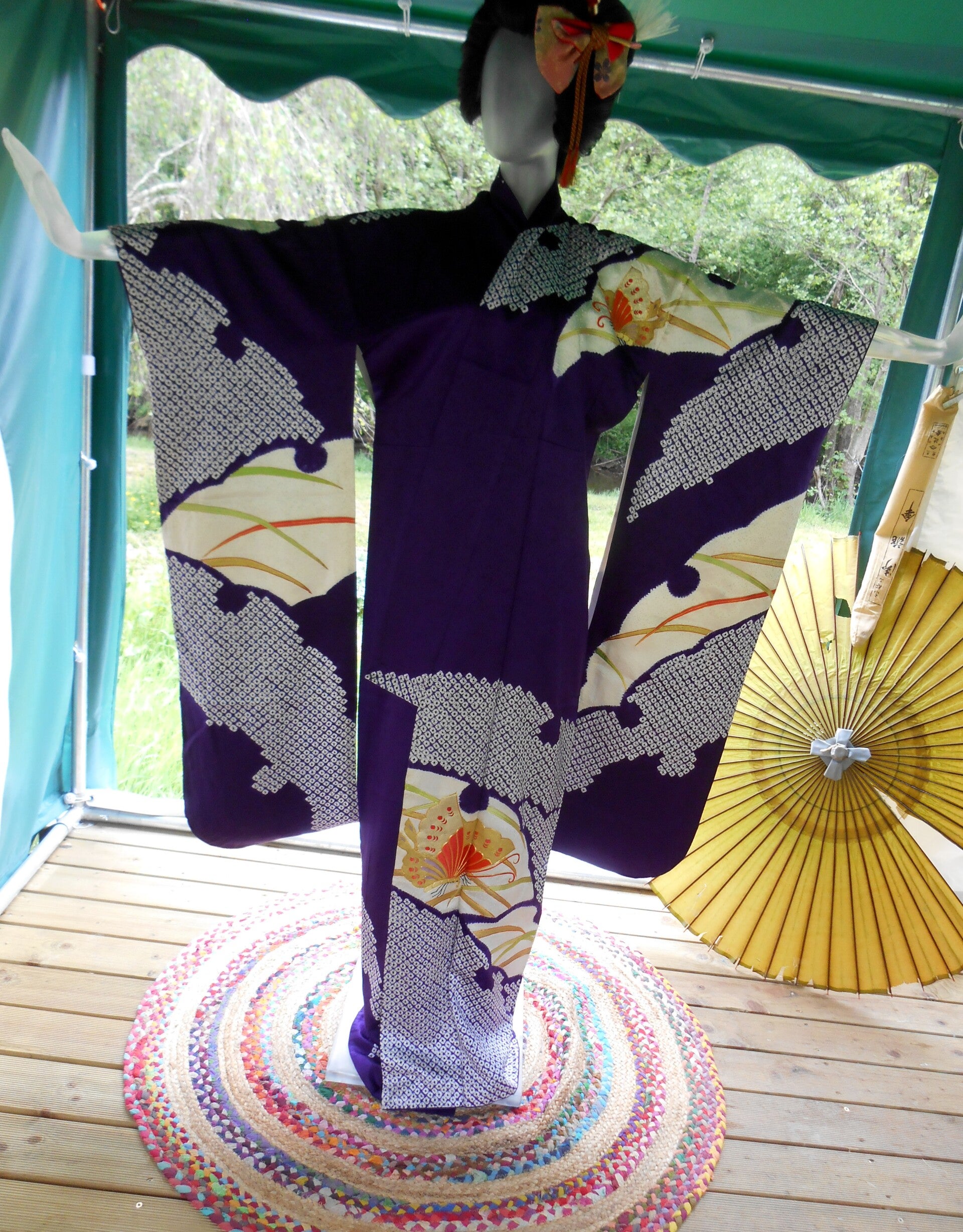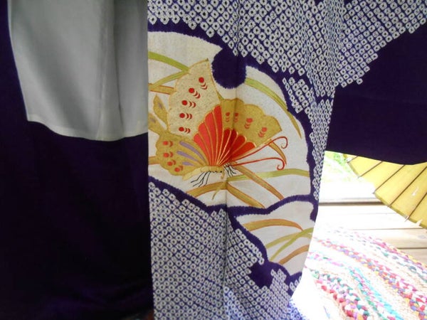 Grote vintage haarstrik, gemaakt van chirimen zijde met een insteekornament. De strik is gemaakt op een goudkleurige kam.