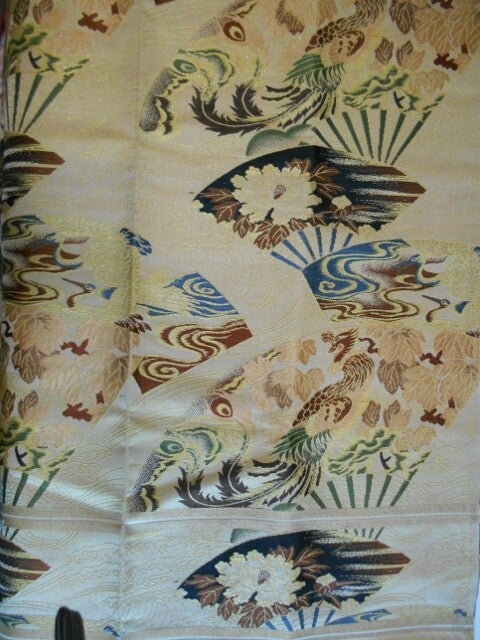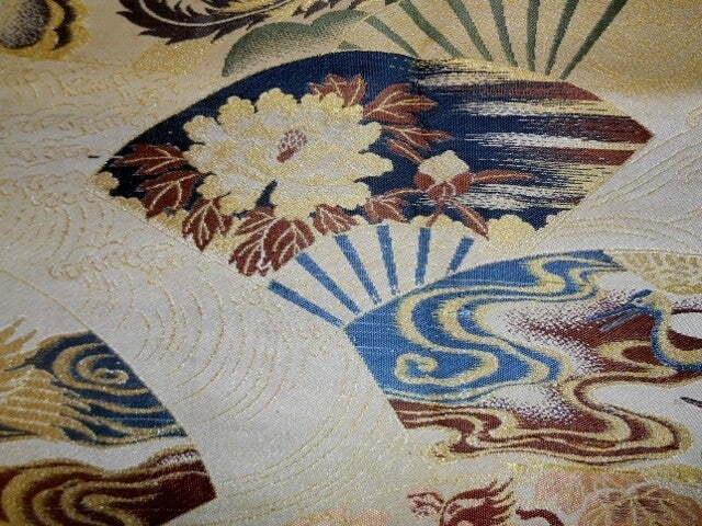 Prachtige antieke maru obizijde met waaiers en vogels.
