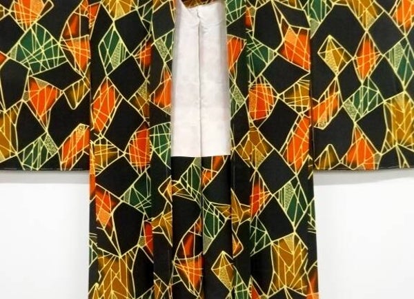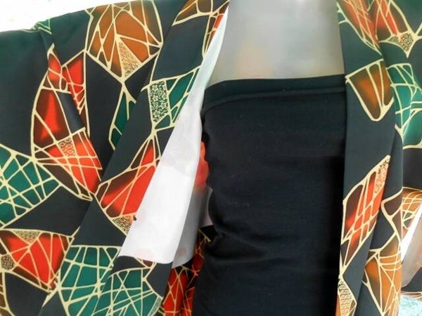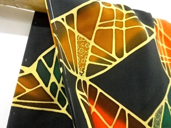 Werkelijk geweldig mooi is deze unieke, ongebruikte haori van natuurlijke zijde. De basis is zwart en de zijde is matglans. De rijgdraden (bewaardraden) worden voor het verzenden verwijderd.