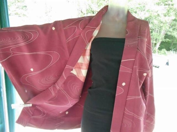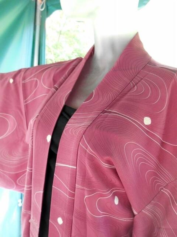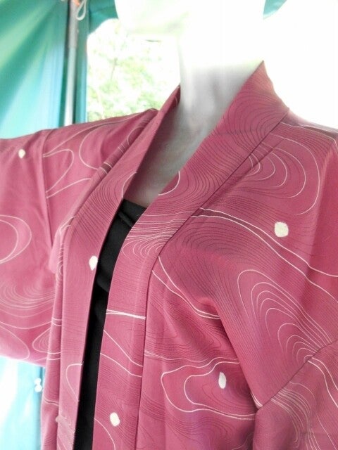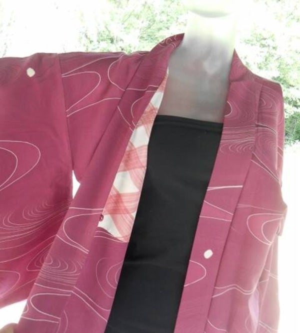 Ongebruikte haori van natuurlijke zijde in een oudroze naar lichtframboze kleur. Het jasje is in Japan gemaakt en is geheel met de hand in elkaar gezet. Met handbewerkte shibori.