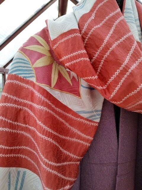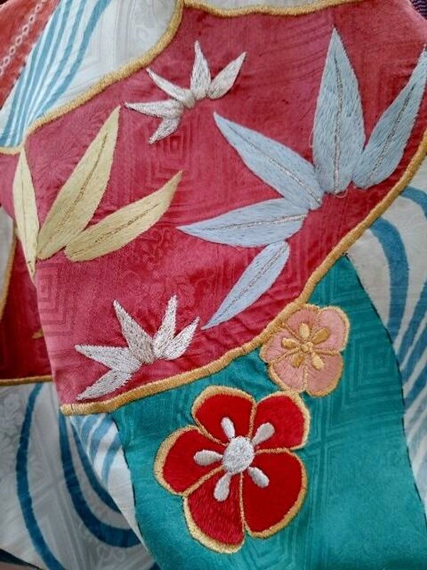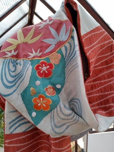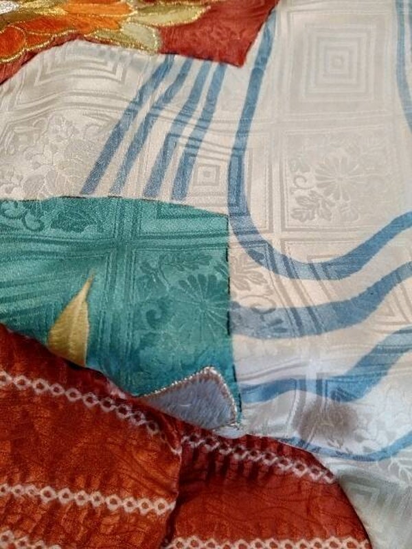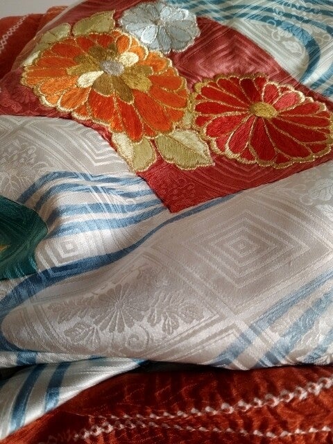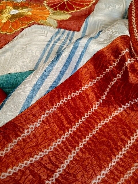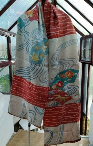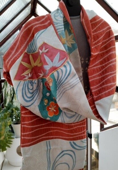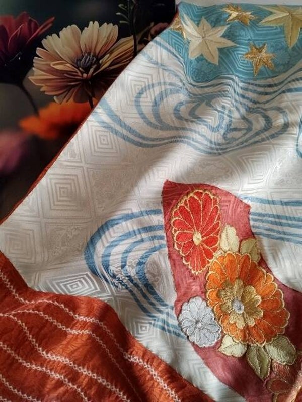 Omslagdoek of brede en extra lange, gevoerde sjaal. Heerlijk zacht en heel luxe is deze blikvanger. Perfect voor een zwoele zomeravond.De zijde is rond 1940 met de hand geborduurd in Japan. De gevoerde kant is pure zijde met shibori van rond 1960. De sjaal zelf is in elkaar gezet in ons atelier in Frankrijk.
