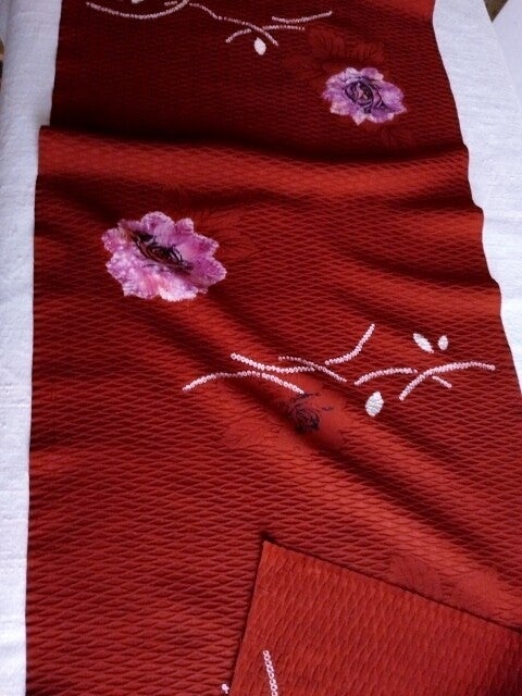 Echt een mooi stuk handwerk zijn deze 2 antieke handgemaakte natuurzijden coupons. Er is gewerkt met shibori, ook de rozen zijn shibori. Keuze uit 2 unieke coupons 95x35cm of 110x35cm