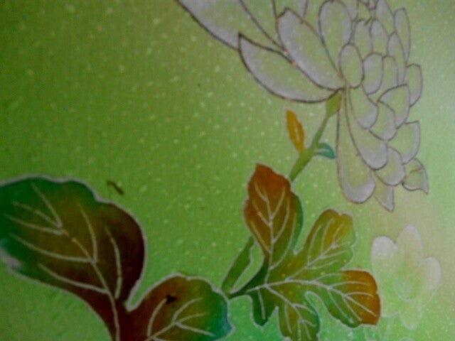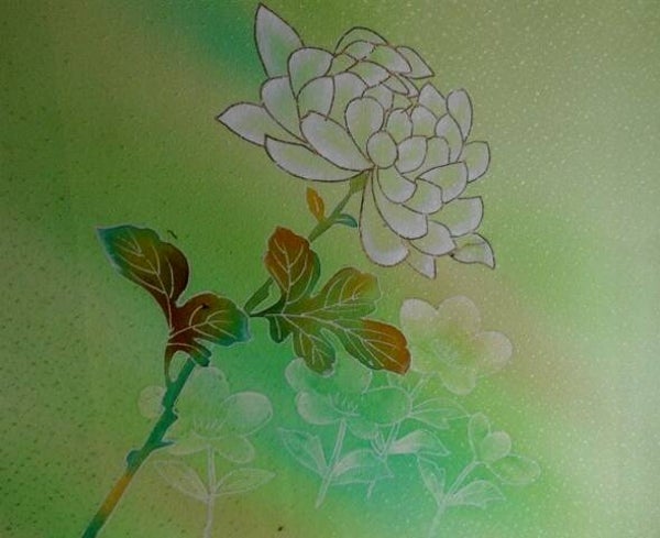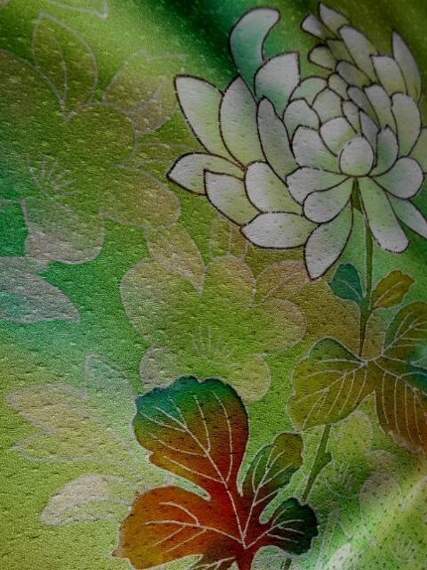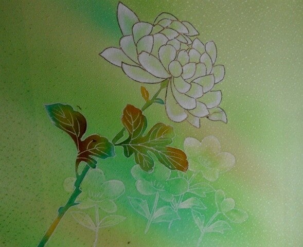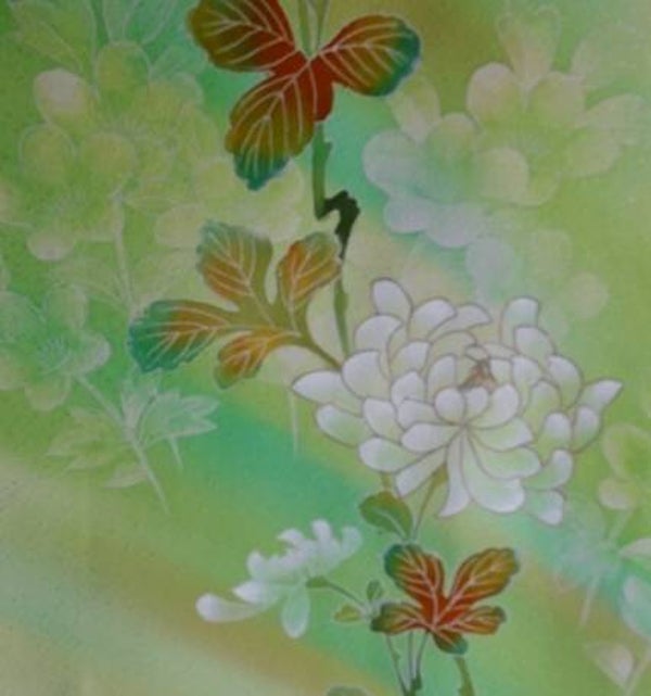 Antieke/vintage kimonozijde handgeschilderd Yuzen met heldere bloemen. Enkele bloemen hebben subtiele goudrandjes. De kunstenaar heeft lichtgroene en aqua tinten als basis van de zijde gebruikt. De zijde zelf is prachtig geweven met kleine verheffingen.