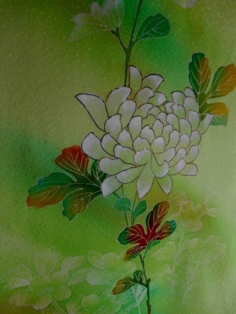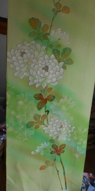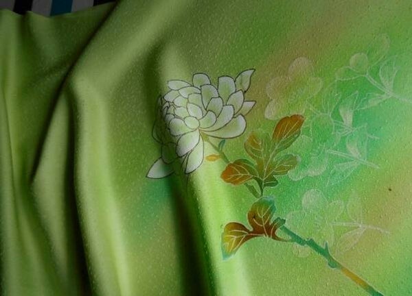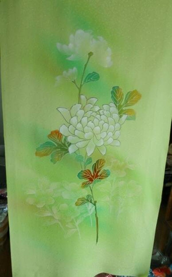 Lichtgroene kimonozijde Yuzen handgeschilderd 100-170x36cm