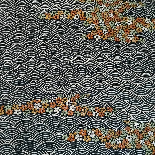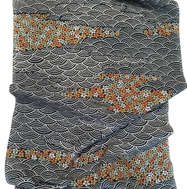 Soepele zeer oude kimono zijde. Het seigaiha bogen motief is vergezeld van bloemenstroken.