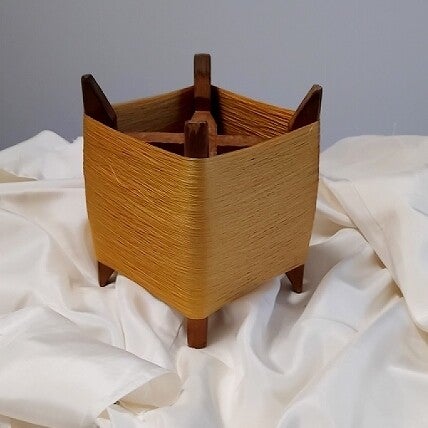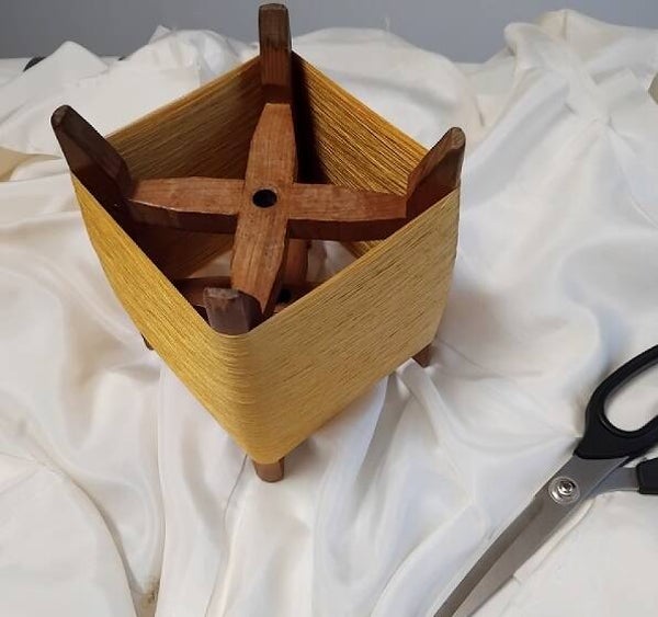 De spoel zelf is van hout en na gebruik van de zijde kan de spoel bijvoorbeeld gebruikt worden als voet voor een lamp of als andere unieke decoratie.