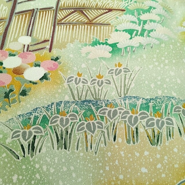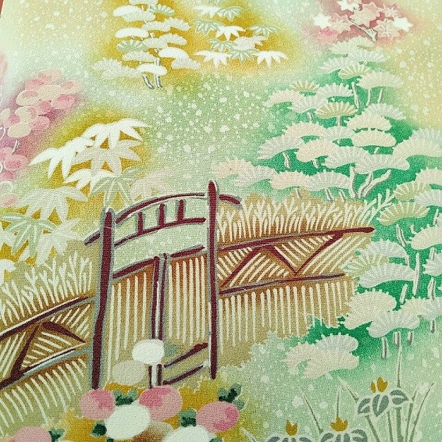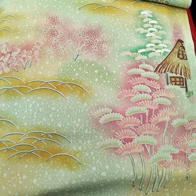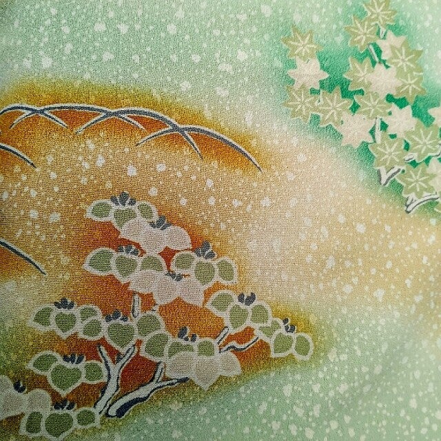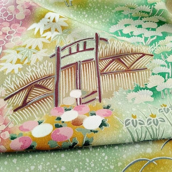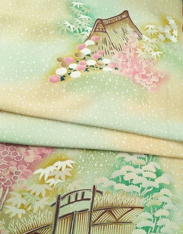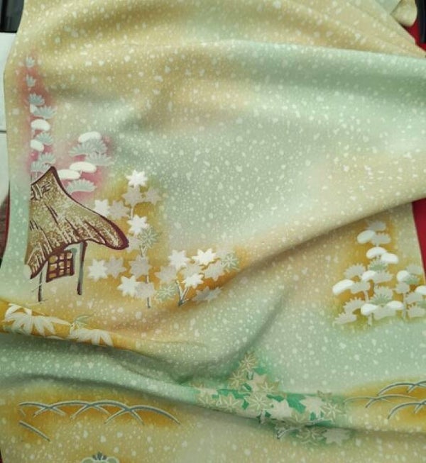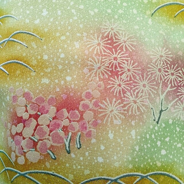 Antieke/vintage kimonozijde handgeschilderd op zacht geel en groene zijde.