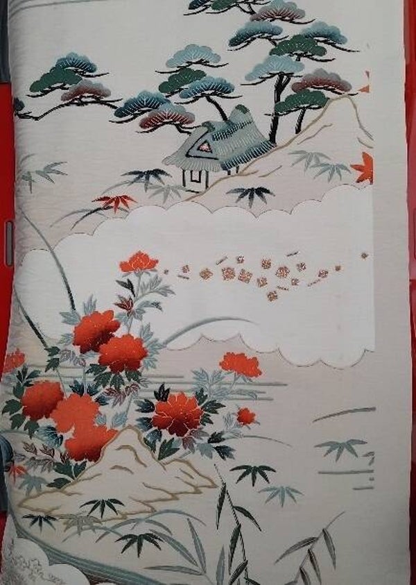 Twee verschillende coupons met handgeschilderde huisjes en bomen. De coupons hebben enkele plekjes door leeftijd van de stoffen. Heel mooi stukje Japanse kunst.