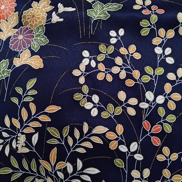 Diep indigoblauwe coupon zijde. Deze bloemen zijn kenmerkend voor Japan. De chrysant wordt in Japan ook koningsbloem genoemd. Verder zijn er bladeren en bloemknoppen op verwerkt.