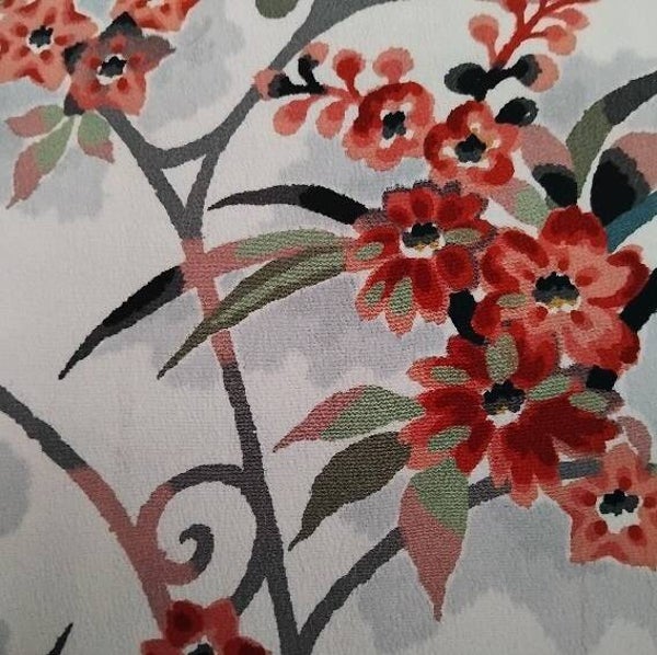 Antieke stuggere crepezijde handbedrukt met mooie bloemen in met natuurlijke verfstoffen. De bloemboeketten hebben subtiele goudrandjes. De kleur is creme met lichtgrijze vlakken rondom de bloemen.