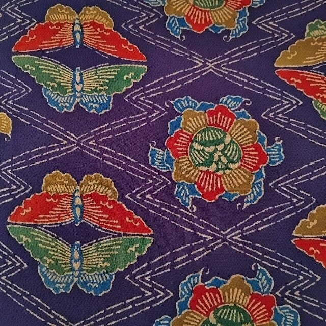 Antieke chririmen zijde in een dieppaarse kleur. Japanse patronen spiegelen soms vlinders en kraanvogels. Deze coupon heeft dit patroon, afgewisseld met een bloempatroon.