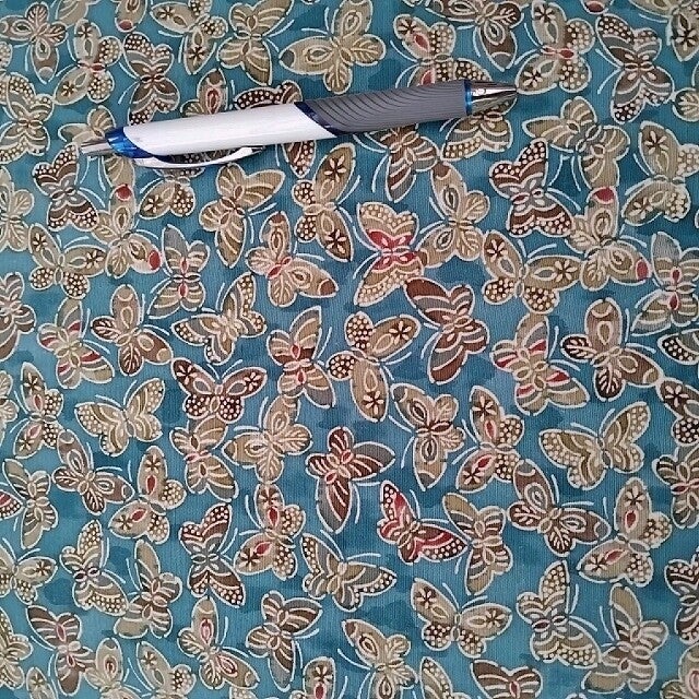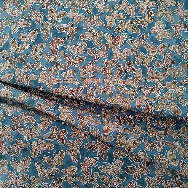 Bijzonder mooie antieke/vintage zijde bewerkt met vlinders. De kleur is turquoise.Soepel vallende zijde geschikt voor kleding, patchwork en quilt.