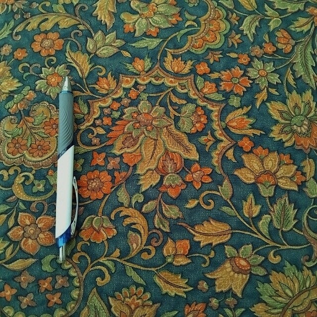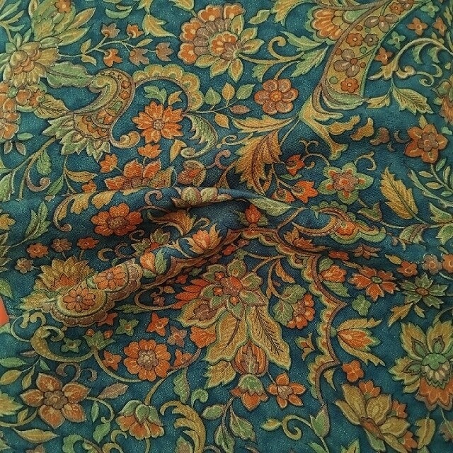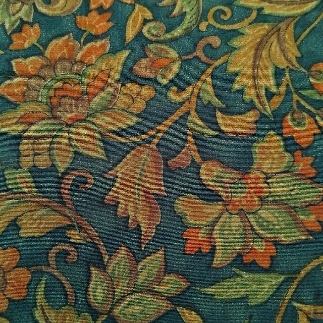 Soepele antieke handbedrukte zijde met mooi motief in natuurlijke kleuren. De kleur is donkerteal.