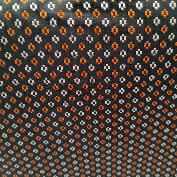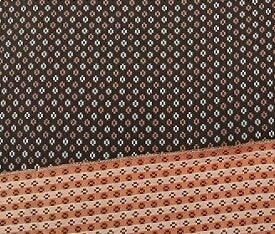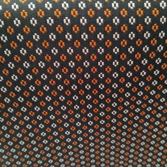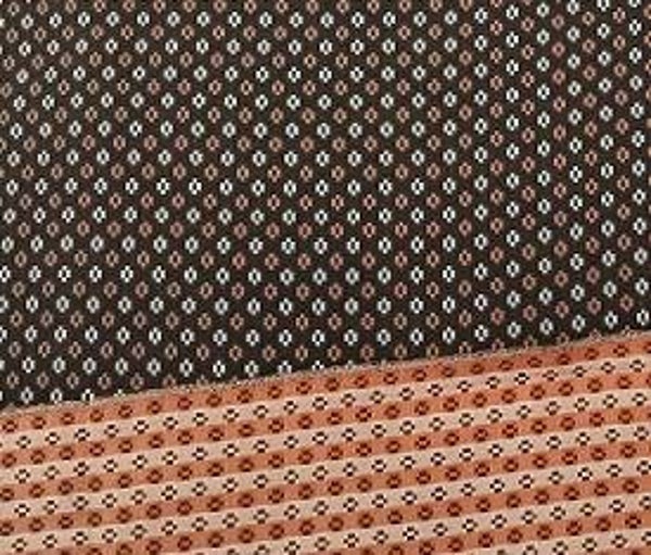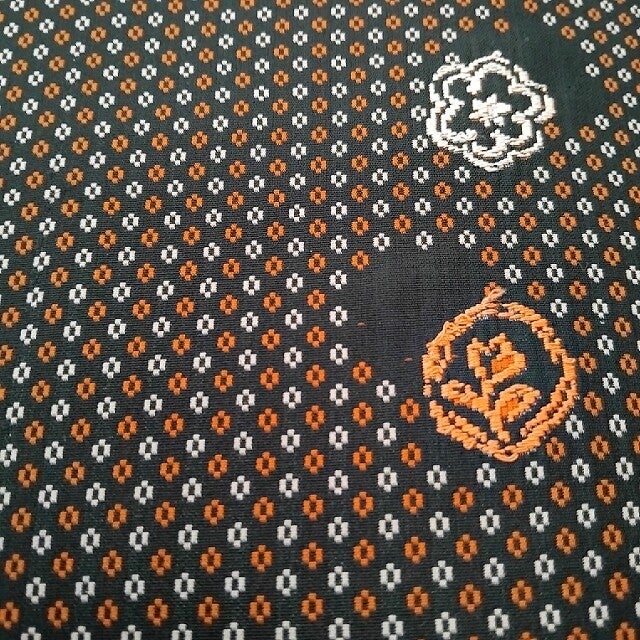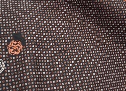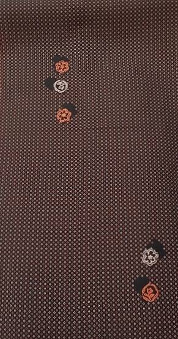 Soepele antieke geweven kimonozijde. De kleur is zacht zwart met vermiljoen en gebroken witte wiebertjes. Her en der zjn er geborduurde bloemen. Door dit kleurenpalet oogt de zijde bruin.