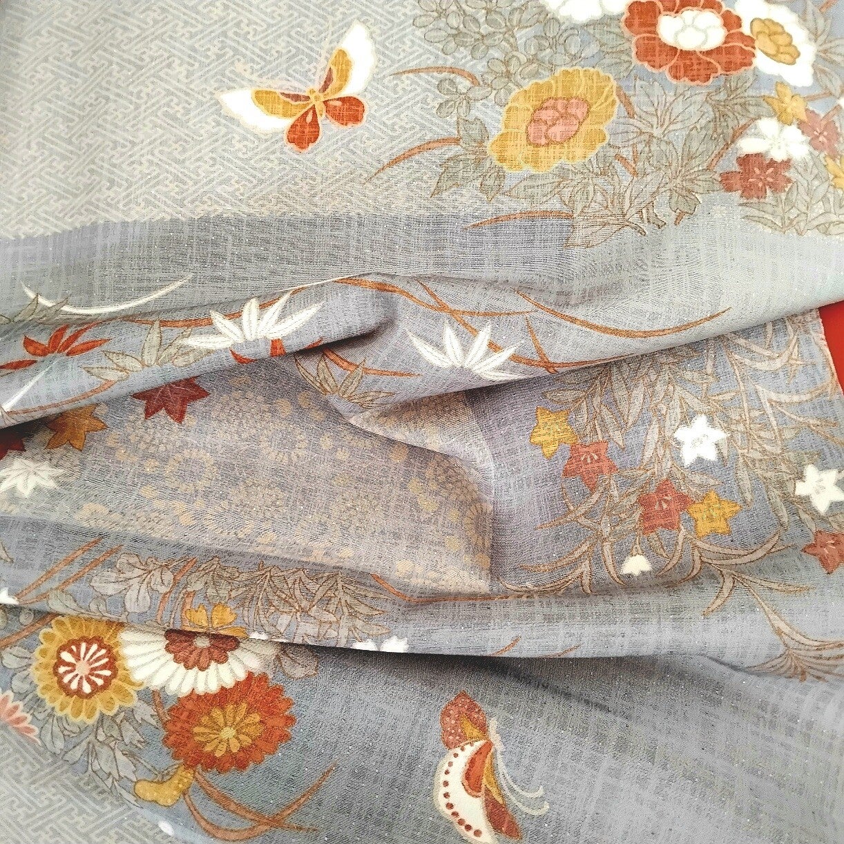 Soepele, stevige mattere zijde met veel motieven, waaronder struiken, koningsbloemen, bloesem en vlinderscoupon 40x37cm voor langere coupon kies meer stuks