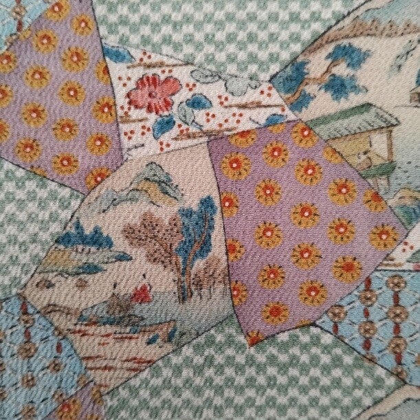 Antieke zijde, soepele chirimen crepe met Japans handwerk blokdruk verschillende motiefjes.