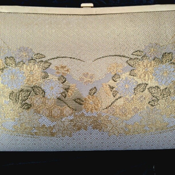 Mooie nieuw kimonotas van goudbrokaat. Deze nieuwe tas is in excellente staat (1980-1990 showmodel). Het heeft een eigen Japans motief. In het tasje zit het draagkettinkje.