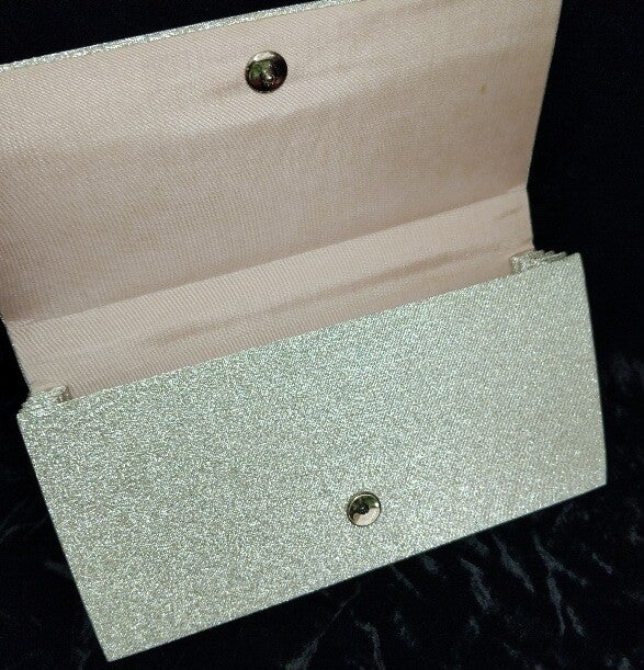 Mooie nieuwe handgemaakte tas van zilverkleurige zijde. Deze nieuwe tas is in excellente staat (1980-1990 showmodel). De tas heeft binnenin een klein extra vakje.