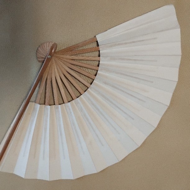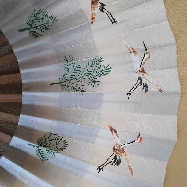 Kleine antieke/vintage waaier met kraanvogels, bomen en de zonGoede staat. Bamboe, Japans papier.