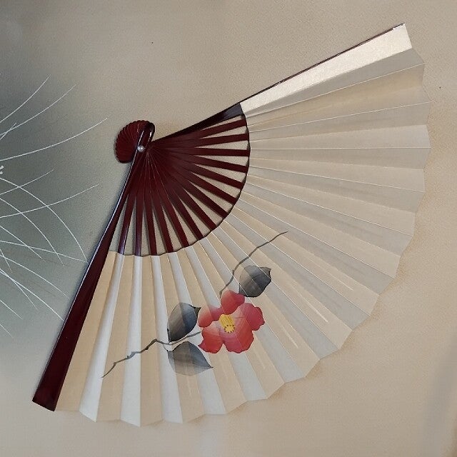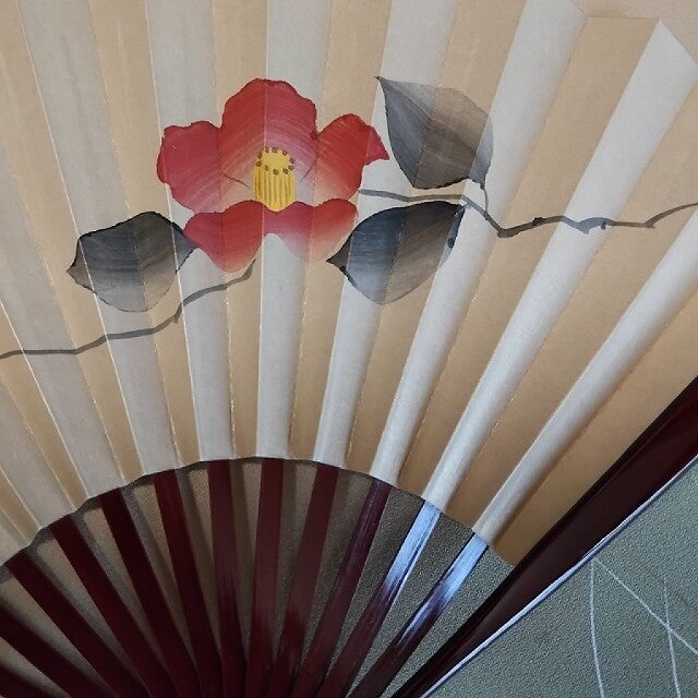 Antieke/vintage waaier met grote bloem op Japans papier en bamboe. Op de achterkant van de waaier zijn een paar bladeren geschilderd. Goede staat.