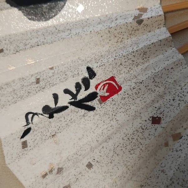 Antieke/vintage mat goudkleurige waaier abstracte tekening en met handtekening en stempel. Goede staat. Bamboe, Japans papier.