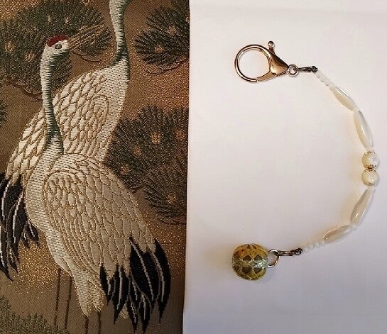 Deze tassenhanger bevat een origineel Japans antiek/vintage haori sluitsieraad gemaakt van steentjes en 2 ingelegde pareltjes en een handgemaakt temari balletje. De lengte is tussen 20 en 23cm