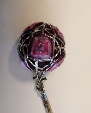 Deze tassenhanger bevat een origineel Japans antiek/vintage haori sluitsieraad gemaakt van een kettinkje met 3 amethist steentjes en een handgemaakt temari balletje. Lengte is tussen 20 en 23cm