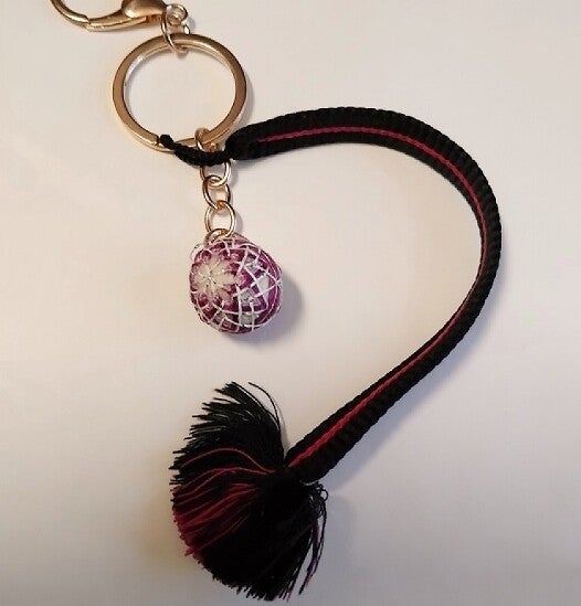 Deze tassenhanger bevat een origineel Japans haori himo van handgeknoopte zijde en een handgemaakt temari balletje. De lengte is tussen 20 en 23cm
