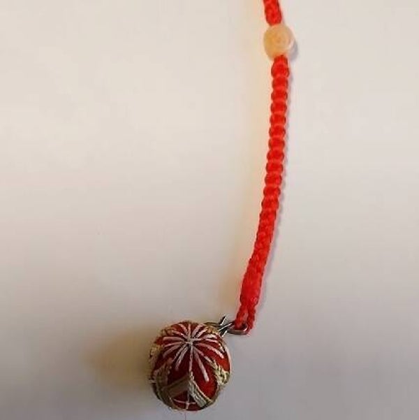 Deze tassenhanger bevat een origineel Japans antiek/vintage haori sluitsieraad dat is gemaakt een handgemaakt zijden koordje met in het midden een bewerkt steentje. Daarbij is een handgemaakt temari balletje bevestigd. De lengte is tussen 20 en 23cm