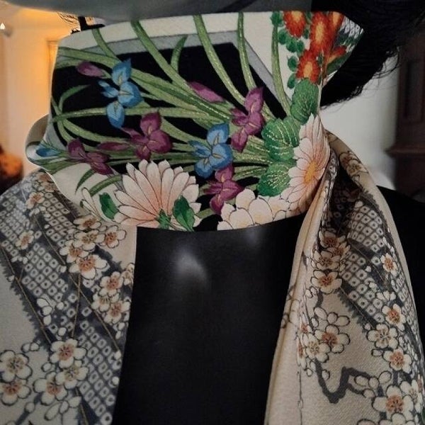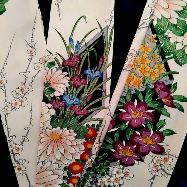 Prachtige zijden sjerp, ceintuur of smalle sjaal met natuurgekleurde, fantastische en adembenemende tinten. Gemaakt van antieke kimonozijde. Uniek, slechts 1 in voorraad